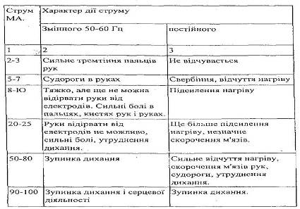 - місцеве ураження організму – опіки, металізація шкіри. Установлено, що найбільша величина електричного струму, що проходить через організм, при якій людина може самостійно відірватися від струмопровідних частин, складає в середньому біля 10 мА.