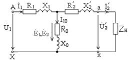 6. На рис. 3 изображена Т-образная схема замещения фазы А трансформатора. Где I1 – действующее значение тока первичной обмотки, I2 ’ = I2 /n - приведенное значение тока вторичной обмотки, E1 – действующее значение ЭДС первичной обмотки, Е2 ’ =Е2 ∙n - приведенное значение ЭДС вторичной обмотки, U1 – действующее значение напряжения на зажимах первичной обмотки, U2 ’ =-U2 ∙n - приведенное значение тока вторичной обмотки, R1 -активное сопротивление, учитывающее потери на нагрев первичной обмотки, R2 ’ = R2 ∙n2 – приведенное значение активного сопротивления, учитывающего потери на нагрев вторичной обмотки, Х1 -индуктивное сопротивление, учитывающее потери мощности на создание потоков рассеяния первичной обмоткой, Х2 ’ = Х2 ∙n2 – приведенное значение индуктивного сопротивления, учитывающего потери мощности на создание потоков рассеяния вторичной обмоткой, I10 – действующее значение тока холостого хода, R0 -активное сопротивление контура намагничивания, учитывающее потери на гистерезис и вихревые токи, Х0 - индуктивное сопротивление контура намагничивания, учитывающее индуцирование E1 и Е2 ’ основным магнитным потоком(реактивную мощность контура намагничивания).