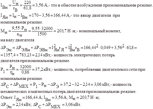 1. Для номинального режима определить ток в цепи якоря, ток в цепи возбуждения, мощность электрических потерь (включая цепь якоря и цепь возбуждения), мощность механических и магнитных потерь.
