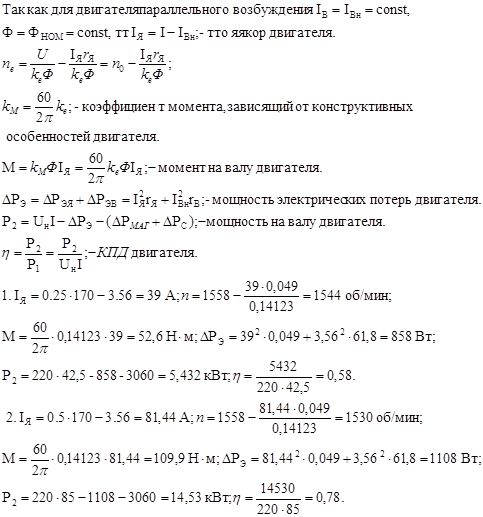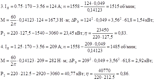 3. Определить ток якоря, момент на валу двигателя и частоту вращения якоря при токах двигателя, равных 0,25; 0,5; 0,75; 1,25 I н . Рассчитать для этих режимов мощность электрических потерь и КПД двигателя, считая мощность механических и магнитных потерь не зависящей от нагрузки.