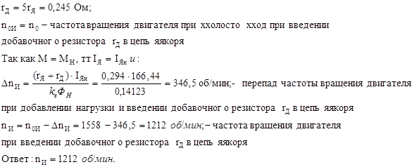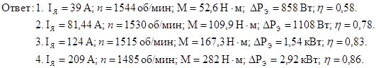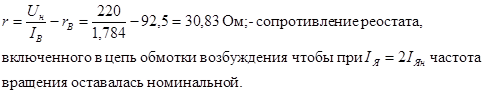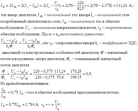 Электродвигатель постоянного тока типа П81 с параллельным возбуждением имеет следующие номинальные данные: мощность - P н =32 кВт; напряжение на зажимах - U н =220 В; ток потребляемый из сети I н =170 A; номинальный КПД - ηн =86%; частота вращения якоря - n н =1500 об/мин; сопротивление цепи якоря - r я =0,049 Ом; сопротивление цепи возбуждения - r в =61,8 Ом.