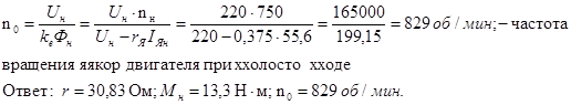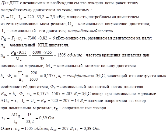 Двигатель постоянного тока с независимым возбуждением имеет номинальный момент Мн=38 Н∙м. Определить сопротивление якоря двигателя, а также ЭДС при номинальной частоте вращения, если n 0 =1600 об/мин. Данные двигателя: U н =220В, I н =33,2 А, ηн =0,82.