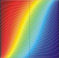 Рис. 2. Распределение потенциала в однородном прямоугольном образце с двумерным дырочным газом в поперечном магнитном поле (μB=1). Белыми линиями показаны линии тока, которые в середине образца практически параллельны боковым сторонам.