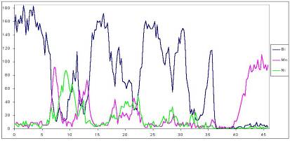 На рис.2 представлен спектр распределения элементов по поверхности разлома вдоль линии сканирования. Максимальная интенсивность пиков принадлежит ионам Bi, которые соответствуют блокам субструктуры с темной окраской. Ионы Mn и Ni распределены более равномерно без особых выбросов интенсивности. Неравномерное распределение элементов по объему образца возможно связано с синтезом Bi2 NiMnO6 и Bi2 CoMnO6 керамик через жидкую фазу Bi2 O3 , температура плавления которого 8250 С, т.е. ниже, чем температура синтеза обоих составов.