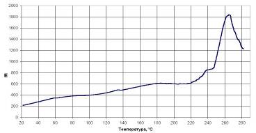 На рис.4 приведена температурная зависимость относительной диэлектрической проницаемости Bi2 NiMnO6 . На кривой e(Т) при температуре 2650 С наблюдается максимум, соответствующий сегнетоэлектрическому фазовому переходу. Выше этой температуры кристаллическая структура образца изменялась в результате значительных искажений на моноклинную с параметрами решетки, значительно отличающимися от параметров решетки при комнатной температуре [5]. Этот фазовый переход из центросимметричного типа к ацентричному, как это имеет место в известном сегнетоэлектрике BiMnO3 [4].