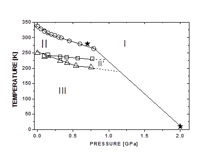 Многие соли пиридина относятся к группе молекулярно-ионных кристаллов с межионными водородными связями. В зависимости от симметрии и размера анионов, эти соединения проявляют большое разнообразие интересных явлений – фазовые переходы, сегнетоэлектричество и динамический ориентационный беспорядок катионов пиридина [1-4]. Сегнетоэлектрическое состояние было обнаружено в тетрафторборате пиридина PyHBF4 (C5 H5 NHBF4 ) [1], хлорокислом пиридине PyHClO4 [2], рениевокислом пиридине PyHReO4 [3] и йодокислом пиридине PyHIO4 [4]. Интерес к изучению последних двух вышеперечисленных соединений связан с тем, что их температура Кюри близка к комнатной температуре. Однако, поведение параметров элементарной ячейки и межатомных связей дейтерированного рениевокислого пиридина (d5 PyH)ReO4 при высоком давлении не исследовались. Зависимость параметров элементарной ячейки от давления можно исследовать с помощью рентгеновской дифракции. Однако этот метод не позволяет определить положение атомов водорода в структуре, особенно если там наблюдается ориентационный беспорядок водородосодержащих ионов. Эту информацию можно получить с помощью метода дифракции нейтронов. Выбор для исследований дейтерированного соединения C5 D5 NHReO4 , изоструктурного с C5 H5 NHReO4 , обусловлен лучшими характеристиками атомов дейтерия для экспериментов по нейтронной дифракции по сравнению с атомами водорода, которые имеют очень большое сечение некогерентного рассеяния нейтронов. Исследования кристаллической структуры дейтерированного рениевокислого пиридина (d5 PyH)ReO4 было проведено с помощью рентгеновской дифракции при давлениях до 3.5 ГПа при комнатной температуре и нейтронной дифракции при высоких давлениях до 2.0 ГПа и низких температурах до 10 К [5]. Обнаружено подавление сегнетоэлектрической фазы II под высоким давлением и стабилизация фазы высокого давления I. Характер фазовой диаграммы (d5 PyH)ReO4 указывает на существование тройной критической точки для фаз I, II и III при давлении около 1.2 ГПа (рисунок 1).