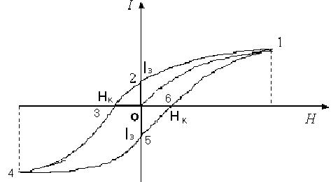 Нехай намагнічування феромагнетика до насичення (точка 1 на рис. 14.7) відбувається по кривій 01. Якщо далі зменшувати напруженість Н зовнішнього намагнічувального поля, то як показує дослід, розмагнічування феромагнетика відбуватиметься за кривою 1-2, розміщеної вище кривої намагнічування. Якщо напруженість намагнічувального поля досягне нуля Н=0, у феромагнетику спостерігається деяке залишкове намагнічування Із , обумовлене тим, що і після припинення дії зовнішнього магнітного поля в частині доменів зберігається переважна орієнтація їхніх магнітних моментів. Щоб повністю розмагнітити даний зразок феромагнетика, треба створити намагнічувальне поле Нк у протилежному напрямку. Величину цього поля Нк називають коерцитивною силою. При дальшому збільшенні зовнішнього поля у протилежному напрямку, намагнічування зразка знову досягне насичення у точці 4. Повертаючись поступово до початкового намагнічування, дістанемо замкнуту криву, яка називається петлею гістерезису.