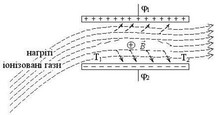 Перерозподіл поперечним магнітним полем електричних зарядів нагрітих відпрацьованих газів (утворюються в котлі при спалюванні палива), приводить до виникнення різниці потенціалів на пластинах конденсатора