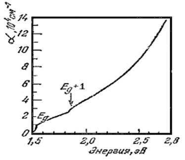 4) Междузонное поглощение: энергия фотона расходуется на создание пары «электрон проводимости + дырка». В отсутствие сильного электрического поля и/или большой концентрации примеси этот тип поглощения опознается по наличию граничной частоты ωm , близкой к Еg /ћ. При ω < ωm поглощение этого типа отсутствует. Следует, однако, заметить, что вид спектра поглощения вблизи частоты ω = ωm в разных материалах оказывается различным. На рисунке 2.1 представлен спектр поглощения арсенида галлия.