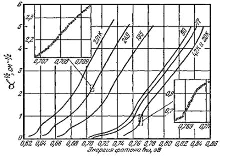 Примерно такие же (в измененном масштабе частот) кривые получаются и при исследовании многих других материалов — антимонида и арсенида индия, антимонида галлия и др. С другой стороны, у ряда интересных полупроводников частотная зависимость и величина показателя поглощения вблизи красной границы оказываются существенно иными. Так, на рисунке 2.2 изображен ход показатель поглощения света в германии при различных температурах. При ω = ωm (ћωm = Eg = 0,66 эВ при комнатной температуре) показатель поглощения относительно мал; он становится сравнимым с тем, что наблюдается в арсениде галлия, лишь при ћω ~ Eg + 0,1 эВ. Похожая картина (в другом масштабе частот) наблюдается также в кремнии, фосфиде галлия и других материалах. Это различие имеет глубокую физическую природу: оно обусловлено тем, что в материалах первого типа экстремумы зон проводимости и валентной лежат в одной точке зоны Бриллюэна, а в материалах второго типа — в разных.