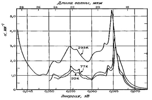 Рисунок 4.1. Спектр поглощения, связанного с колебаниями решетки, высокоомного GaAsn-типа в области энергий 0,04 — 0,07 эВ (нижняя шкала) при 20, 77 и 293 К.