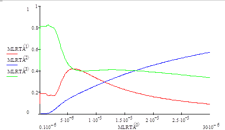 Рисунок 6.2 Рассчитанные спектральные зависимости энергетических коэффициентов поглощения (зеленая), пропускания (синяя) и отражения (красная) при N1 = 1.8 + 1.0iN2 = 3.0 + 1.0idмультипленки = 0.6 мкм.
