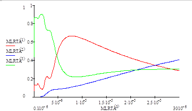 Рисунок 6.3 Рассчитанные спектральные зависимости энергетических коэффициентов поглощения (зеленая), пропускания (синяя) и отражения (красная) при N1 = 1.6 + 0.8iN2 = 5.0 + 1.0idмультипленки = 0.6 мкм.