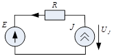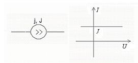 2. Источник тока j, J– это такой элемент, через который при любом напряжении между его зажимами проходит один и тот же ток равный величине источника тока. Если величина источника тока равна 0 (j=0), то i= j = u/R = 0, то при любом напряжении ток на этом участке будет равен нулю (разрыв цепи). Поэтому считают, что внутреннее сопротивление источника тока бесконечно: Rвн