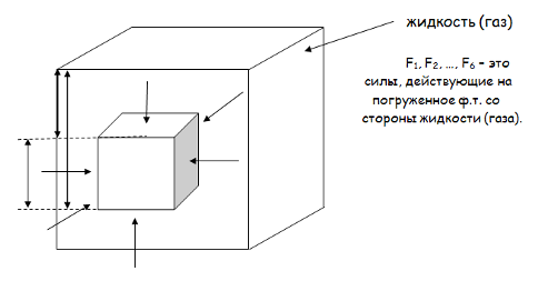 1) На тело, погруженное в жидкость (газ), действует выталкивающая сила, равная весу вытесненной им жидкости.