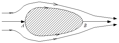 В стационарных задачах линии тока и траектории совпадают, т.к. нормальная составляющая скорости к линии тока равна нулю, жидкость через линию тока не перетекает. В плоских течениях количество жидкости между двумя линиями тока в любых сечениях будет одинаково. Если линии тока приближаются, то скорость потока увеличивается, и наоборот. Через каждую точку в потоке можно провести только одну линию тока, исключение составляют особые точки: критические точки. А и В – это критические точки. Поверхность непроницаемого тела – поверхность тока, а линии тока, расположенные на поверхности называется нулевыми линиями тока.