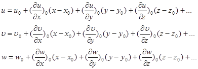 . Для жидкой частицы основная теорема кинематики гласит, что скорость движения любой точки жидкой частицы складывается из скорости квазитвердого движения и деформационного. Квазитвердое состоит из поступательного вращательного: