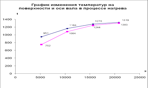 4. Построить в масштабе график изменения температур на поверхности и оси вала в процессе нагрева.