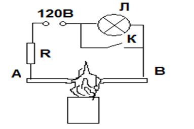 Стеклянная палочка АВ включена в осветительную сеть через реостат R. Пока палочка холодная, ток в цепи ничтожный из-за высокого сопротивления стекла. Если палочку нагреть газовой горелкой до температуры 300-400 0 С, то ее сопротивление упадет до нескольких десятков омов и нить лампочки Л раскалится. Теперь можно закоротить лампочку ключом К. При этом сопротивление цепи уменьшится, и сила тока возрастет. В таких условиях палочка будет эффективно нагреваться электрическим током и раскаляться до яркого свечения, даже если убрать горелку[16] .