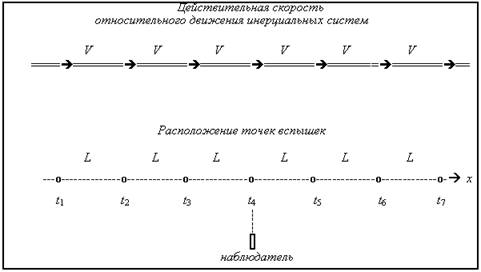 Пусть в некоторой инерциальной системе покоится источник, который излучает световые импульсы через равные промежутки времени Т . В инерциальной системе отсчета, где находится неподвижный наблюдатель, этот источник будет двигаться относительно наблюдателя с некоторой постоянной скоростью вдоль оси х . Поскольку относительная скорость инерциальных систем отсчета постоянна, неподвижный наблюдатель будет видеть вспышки, причем точки вспышек будут располагаться на равном расстоянии L друг от друга. Измеряя время между соседними вспышками (tn – tn -1 ), и зная, что расстояние между ними равно L , он может вычислить скорость для различных участков оси х .