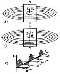 Направление суммарного магнитного поля всех свободных электронов в проводе формирует вокруг него магнитное поле (рис. 1, а, b), направление которого меняется с изменением направления векторов магнитных моментов