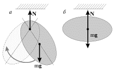 Тело, подвешенное в точке, не совпадающей с его центром масс (физический маятник), начинает колебаться (рис. 3.2а) - есть момент силы тяжести относительно точки подвеса, возвращающий отклоненный маятник в положение равновесия. Но тот же маятник, подвешенный в центре масс, находится в положении безразличного равновесия (рис. 3.2б).