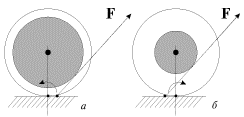 Роль момента силы наглядно проявляется в опытах с "послушной" и "непослушной" катушками (рис. 3.3). Плоское движение этих катушек можно представить как чистое вращение вокруг мгновенной оси, проходящее через точку соприкосновения катушки с плоскостью. В зависимости от направления момента силы F относительно мгновенной оси катушка либо откатывается (рис. 3.За), либо накатывается на нитку (рис. 3.Зб). Держа нить достаточно близко к горизонтальной плоскости, можно принудить к послушанию самую "непослушную" катушку.