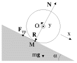 Уравнение движения центра масс (3.1) запишем для проекций ускорения и сил на ось x вдоль наклонной плоскости, а уравнение моментов (3.22) - для проекций углового ускорения и момента силы трения на ось y , совпадающую с осью цилиндра. Направления осей x и у выбраны согласованно, в том смысле, что положительному линейному ускорению оси цилиндра соответствует положительное же угловое ускорение вращения вокруг этой оси. В итоге получим: