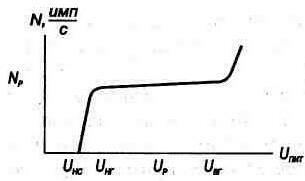 Каждая фиксируемая счетчиком частица вызывает появление в его выходной цепи короткого импульса. Число импульсов, возникающих в единицу времени, - скорость счета счетчика Гейгера - зависит от уровня ионизирующей радиации и напряжения на его электродах. Типичный график зависимости скорости счета от напряжения питания Uпит показан на рис. П4.2. Здесь Uнс - напряжение начала счета; Uнг и Uвг - нижняя и верхняя граница рабочего участка, так называемого плато, на котором скорость счета почти не зависит от напряжения питания счетчика. Рабочее напряжение Uр обычно выбирают в середине этого участка. Ему соответствует Nр - скорость счета в этом режиме.