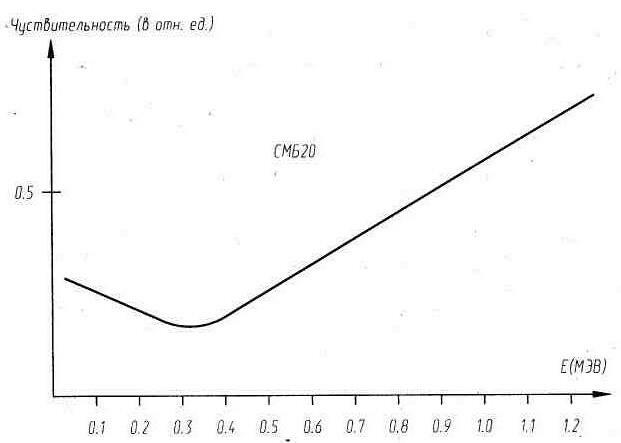 Еще одной важной характеристикой счетчика Гейгера является зависимость его радиационной чувствительности от энергии («жесткости») ионизирующих частиц. На профессиональном жаргоне график этой зависимости называют «ходом с жесткостью». В какой мере эта зависимость важна, показывает график на рис. П4.3. «Ход с жесткостью» будет влиять, очевидно, на точность проводимых измерений.
