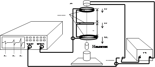 Когда выключатель включен, то поле в катушке удерживает магнит от падения. Когда размыкаешь цепь, то поле исчезает, то под действием силы тяжести магнит начинает падать с ускорением g . А в это время осциллограф переходит в другой режим работы, а именно он запоминает график зависимости напряжения от времени.