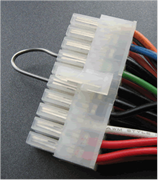 2. Знайдіть металеву канцелярську скріпку, і зігніть її по формі букви П, щоб відстань між кінцями було приблизно 4-5 мм. На основному роз'ємі БП (20 або 24 контакту), знайдіть Піни з чорним і зеленим проводами (знаходяться поруч один з одним - що замикати - показано на фото нижче).