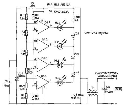 Якщо жоден з світлодіодів не світиться, то це означає, що напруги нижче рівня 11,7 В. Савчин індикатора HL1 інформує водія про несправності в роботі системи регулятор-генератор - при працюючому двигуні він виробляє заряд акумулятора, але напруга при цьому не повинно перевищувати 14,8 В. Якщо ж світиться індикатор HL4, це означає, що акумулятор розряджений більш ніж на 50% і його необхідно терміново ставити на заряджання.
