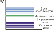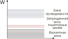 Как видно, энергетические уровни акцепторов располагаются немного выше валентной зоны. На эти уровни легко переходят электроны из валентной зоны, в которой при этом возникают дырки.