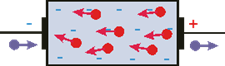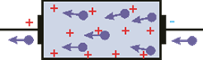 На рисунке плюсами и минусами обозначены заряженные атомы кристаллической решетки. Электроны соответственно темные, дырки красные кружочки со стрелочками. Под действием ЭДС источника в проводах, соединяющих полупроводник n-типа с источником, и в самом полупроводнике движутся электроны проводимости. В соединительных проводах полупроводника p-типа по прежнему движутся электроны, а в самом полупроводнике ток следует рассматривать как движение дырок. Электроны с отрицательного полюса поступают в полупроводник и заполняют пришедшие сюда дырки. К положительному полюсу приходят электроны из соседних частей полупроводника, и в этих частях образуются дырки, которые перемещаются от правого края к левому. В электротехнике принято условное направление тока от плюса к минусу. При изучении электронных приборов удобнее рассматривать прохождение тока от минуса к плюсу, что, собственно, и является истинным направлением тока.