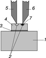 Рис. 4. Точечный транзистор, изображенный схематически. Две заостренные проволочки прижаты к полупроводниковому кристаллу n-типа (германий), припаянному к металлическому кристаллодержателю. 1 – латунный или иной кристаллодержатель; 2 – области p-типа; 3 – припой или золотой сплав (контакт базы); 4 – кристалл n-типа; 5 – эмиттерный точечный контакт (бериллиевая бронза); 6 – коллекторный точечный контакт (фосфористая бронза); 7 – область n-типа.
