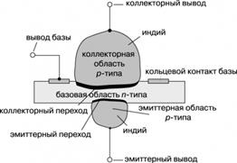 Кристаллическую ось германия выбирают таким образом, чтобы граница раздела между индием и германием была плоской и параллельной одной из кристаллических плоскостей германия. При этом два перехода, приближающихся друг к другу с противоположных сторон пластинки, оказываются параллельными и могут быть подведены очень близко друг к другу. При охлаждении германий снова кристаллизуется на исходной пластинке. Рекристаллизованная область теперь становится областью p-типа, так как она сильно легирована индием. К оставшемуся за ее пределами индию можно припаять выводы. Транзисторы npn-типа изготавливаются по аналогичной технологии, но в этом случае в исходный германий p-типа вплавляется ввод, легированный сурьмой.
