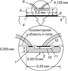 Тысячи таких микрокристаллов могут одновременно обрабатываться методом диффузии. 1 – базовая область p-типа; 2 – коллекторный переход; 3 – слой диоксида кремния; 4 – коллекторный контакт; 5 – микрокристалл кремния; 6 – вывод базы; 7 – эмиттерный вывод; 8 – электрическое соединение золото – кремний; 9 – металлический кристаллодержатель; 10 – напыленный электрод; 11 – эмиттерная область n-типа; 12 – эмиттерный переход.