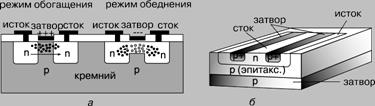 Для изготовления МОП-транзисторов используется высокоомный кремний p- или n-типа. В кремнииp-типа методом диффузии создаются две сильно легированные близлежащие областиn-типа. Одна из них, называемая истоком, является входной. Другая – сток – служит выходом. Над узкой промежуточной областью наращивается тонкий изолирующий слой (толщиной 200 нм и менее) диоксида кремния. На него наносят слой металла или кремния, который служит управляющим электродом (рис. 7). Такое устройство и называется полевым транзистором со структурой металл – оксид –полупроводник (МОП-транзистором). При подаче на управляющий электрод положительного напряжения возникает сильное электрическое поле, которое притягивает электроны к поверхности кремния, и образуется проводящий каналn-типа, соединяющий исток со стоком. Режим с положительным напряжением называется режимом обогащения. Можно изготавливать приборы, открытые в отсутствие внешнего напряжения. Отрицательное напряжение в них сужает канал и повышает его сопротивление; такой режим называется режимом обеднения. Изготавливаются также транзисторы с каналомp-типа.