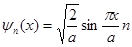 где n– номер квантового состояния, a – размер ямы. На рис. 2 изображены три такие функции, соответствующие n = 1, 2, 3, … Электронная плотность в яме распределяется неравномерно, есть максимумы и минимумы плотности вероятности. Из формулы (1) следует также, что длины волн Ч'-функций, описывающих электронные состояния с различными n, удовлетворяют условиям