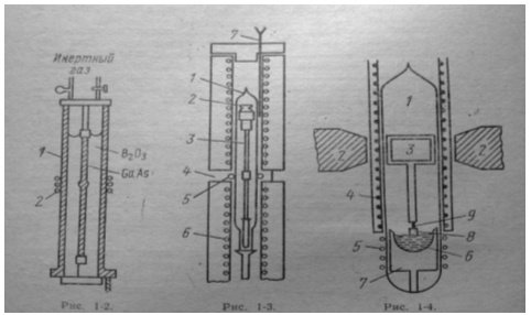 Используются два варианта вытягивания кристаллов по методу Чохральского: в запаянной ампуле, где создается требуемое давление паров мышьяка, и под слоем флюса, например В2 О3 .