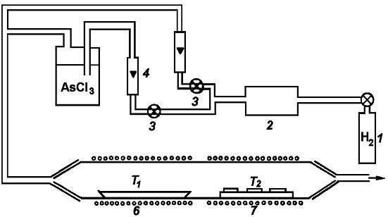 Процесс проводится с помощью установки, изображенной на рис.2.4 Исходный галлий 6 и подложки 7 помещаются в кварцевую трубу, которая расположена в двузонной печи сопротивления. В кварцевый реактор подается смесь водорода и паров AsCl3 . Для дозировки соотношения AsCl3 /H2 поток водорода разделяется на две нити; по одной дозированное количество водорода подается непосредственно в реактор, а по другой сначала проходит через питатель, содержащий AsCl3 , насыщается парами AsCl3 , а затем смешивается с основным потоком водорода. Парогазовая смесь, попадая в реактор, нагретый до температуры Т1 , подвергается реакции