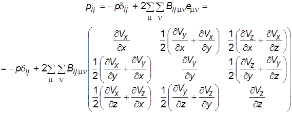 – элементы единичной матрицы (с единицами на главной диагонали и нулями на всех остальных местах), матрица размерности 3´3, обозначенная emn, называется тензором скоростей деформации, а тензорный коэффициент линейности Bijmn описывает свойства вязкой жидкости.