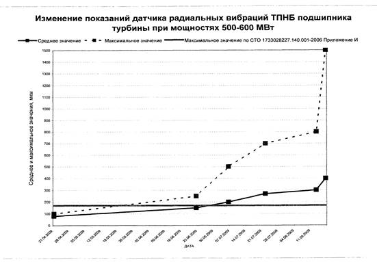 Рис 1. Изменение показателей датчика радиальных вибраций ТПНБ подшибника турбины при мощностях 500-600 МВт