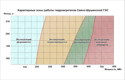 Рис 2. Характерные зоны работы гидроагрегатов Саяно-Шушенской ГЭС
