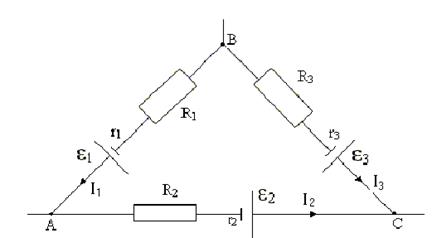 На цьому рисунку точки А,В,С називаються вузловими точками. В ці точки входять і виходять не менше трьох струмів. Для вузлових точок у відповідності із законом збереження електричних зарядів, має виконуватись умова, згідно з якою
