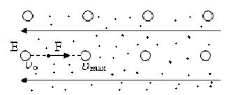 Будемо вважати, що між двома сусідніми взаємодіями з вузлами кристалічної решітки носії струму рухаються з прискоренням a. Нехай між двома сусідніми взаємодіями кожен з електронів вільно рухається протягом часу . Перед взаємодією швидкість електрона досягає максимального значення max Вириваючись із вузла решітки швидкість електрона дорівнює нулю.