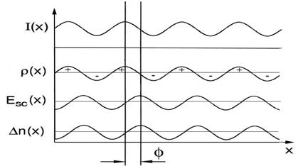 Таким чином, інтерференційна картина у фоторефрактивному середовищі приводить до появи світлоіндукованого поля просторового заряду Еsc , яке може досягати декількох кВ/см2 . Домінування дифузії в цьому процесі приводить до фазового зсуву просторового розподілу поля Еsc відносно інтерференційної картини, з максимумами в точках, де градієнт заряду максимальний.