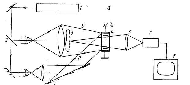 Рис.2.1. Схема установки для двохекспозиційної голографічної інтерферометрії прозорих об'єктів (а) і типові двохекспозиційні голографічні-ітерферограми прозорих об'єктів, отримані в [9,10] при запису в кристалах BSО (б,в).1- лазер, 2- світоподільник, 3- спостережуваний об'єкт, 4 — зразок взірець ФРК, 5 — проектуюча лінза, 6 — видікон, 7 — монітор.
