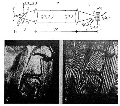 На відміну від розглянутих вище дана методика призначена для контролю рельєфу поверхні і точності позиціонування спостережуваних об'єктів. Інтерферограмма тут також двохекспозиційна, проте голограми записуються не в різні моменти часу, а на різних довжинах хвиль λ1 і λ2 , близьких по величині |λ1 - λ2 | << λ1 , 2 (рис. 2.3, а). Відновлення інтерферограмм здійснюється на одній з довжин хвиль λ1 або λ2 . В результаті інтерференції двох хвильових фронтів, відновлюваних з двох вказаних голограм, відбувається порівняння фазових рельєфів одного і того ж об'єкту, але взятих в різному масштабі. Відновлене зображення буде покрито системою смуг, що відповідають рельєфу поверхні: центр кожної світлої або темної смуги відповідає точкам, що залягають на однаковій глибині щодо плоского хвильового фронту, освітлюючого об'єкт. Перехід з однієї темної смуги на поряд лежачу означає зсув по глибині об'єкту на величину: